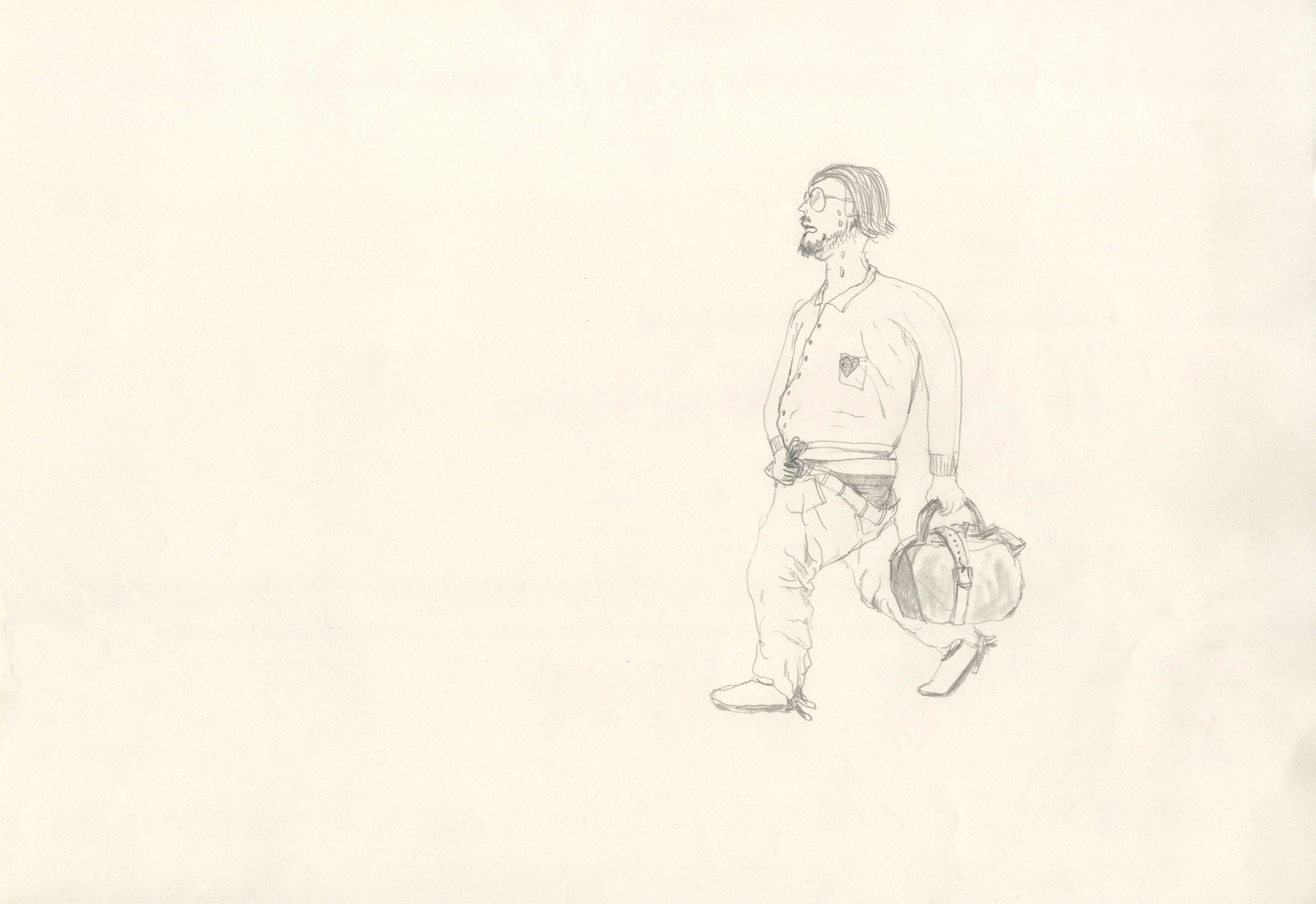 출근 도중 가방의 잠금 장치가 망가져서, 허리끈으로 가방을 동여매고 수업 왔다는 박찬경 선생님 얘기가 웃겨서 그렸다