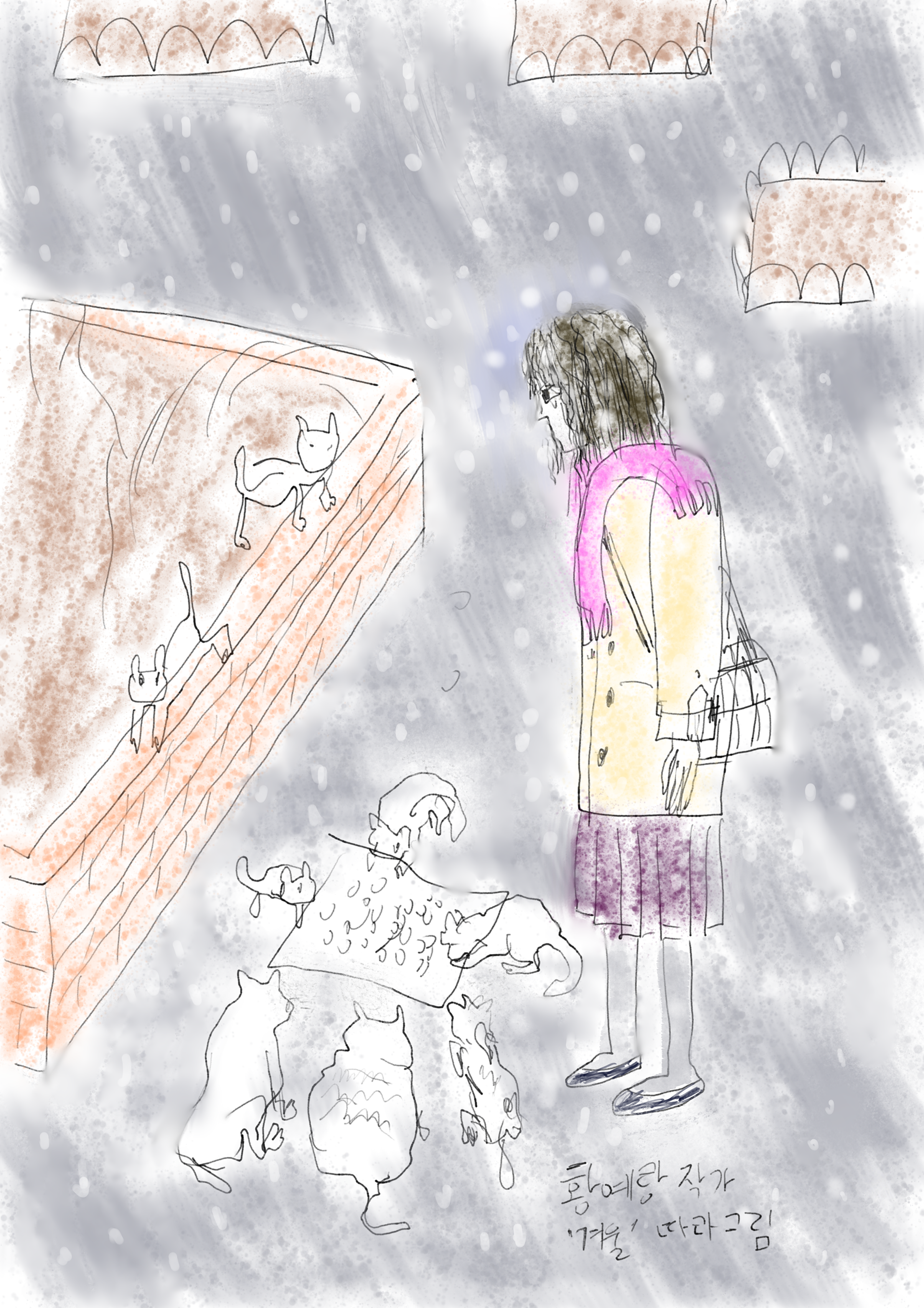 황예랑 작가님의 초기 명작을 모사해봤다. 밥주는 분의 고지식한 패션 디테일과 처량함이 너무 사실적이라, 한 번 이 그림을 본 뒤로 잊을 수가 없었다. 원작은 @yeroong의 계정에 업로드 되어 있다.